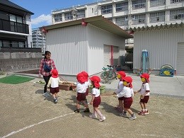 こんな風にお散歩しながら、園内のいろいろな場所を知ったり、春の自然にふれたり、遊ぶ時の約束を知ったりできるようにしています。