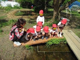 今日はバスに乗って、ビオランド(南園庭)の一番端までみんなでお出かけしました。お花を見ながら歩いたり、「何かいるかな?」とお池をのぞいたりして楽しみました。イチゴのプランターの前では「イチゴの赤ちゃんあった」「赤くなってる!」と探しては喜んでいました。美味しくなるまで待っていてね。