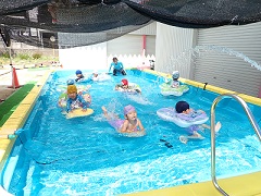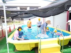 プール開放の3日間、先生たちもクラスを交代して遊びました。5歳児に感想を聞くと、どの先生の遊びも面白くて楽しかったそうです。いつもと違う雰囲気を子どもたちも味わいながら楽しんでくれていたようです。「先生、また一緒にプールに入ろうね」と違うクラスの子どもたちからも声をかけられ、先生たちも嬉しかったです。