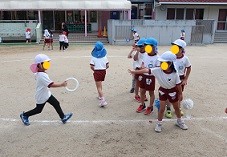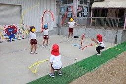 運動会を終えて初めての登園日。園庭で早速運動会の遊びが始まりました。5歳児の姿に憧れていた3,4歳児。リレーやリボンダンスを5歳児に教えてもらいながら一緒に楽しみました。明日からも、みんなで一緒に体を動かして遊ぼうね!