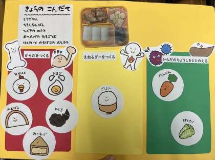 次に、今日の給食の食材のグループ分けを行い、写真のようなボードを完成させました。たくさんの食材が使われていることを知り、驚いた様子でした。
