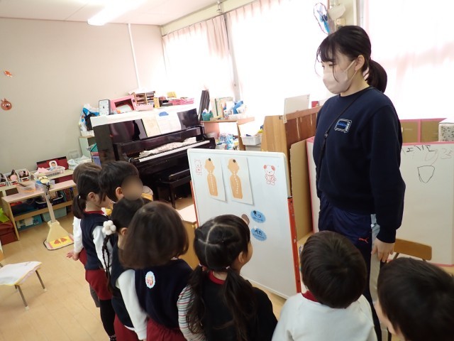3歳児あか組では「良い姿勢」について保健指導を行いました。もし骨がなかったら立ったり歩いたりできないことを伝え、骨の大切さを知らせました。また、「ここにも骨があるよ」「腕を曲げると肘が硬くなるよ」と身体の骨を触り、自分自身の身体にも骨があることを確かめました。