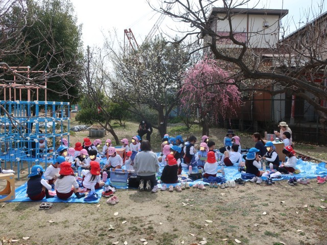 梅の花が満開になりきれいだったので、梅の花の下で全クラス集まっておにぎりを食べました。梅の下で食べるおにぎりはとても美味しかったよ。みんな良い顔で食べていました。
