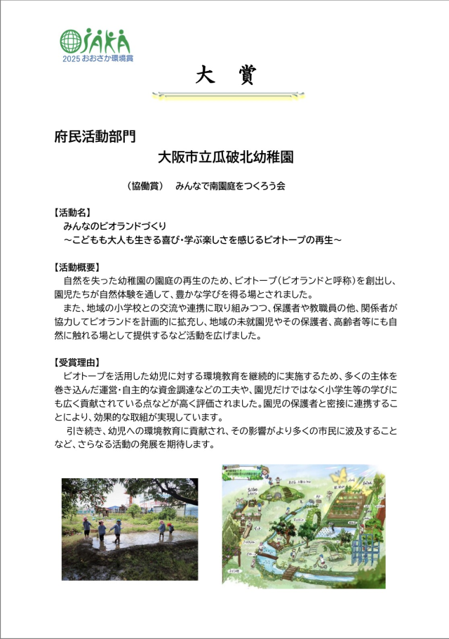 このたび、当園の取り組み「みんなのビオランドづくり~こどもも大人も生きる喜び・学ぶ楽しさを感じるビオトープの再生~」が、令和7年度「おおさか環境賞」府民活動部門において大賞を受賞いたしました。