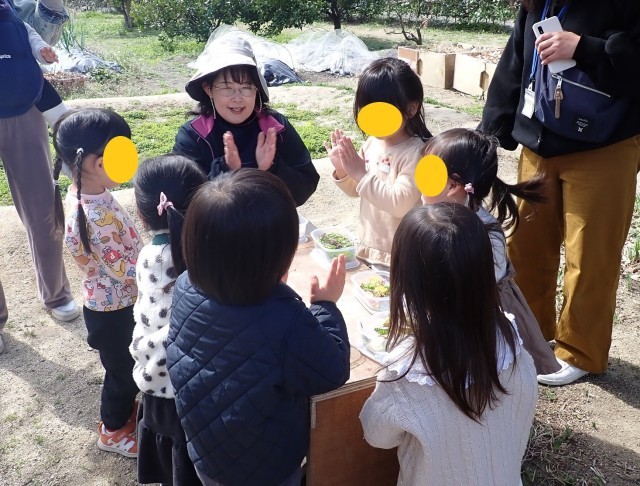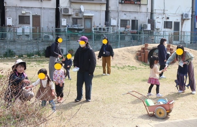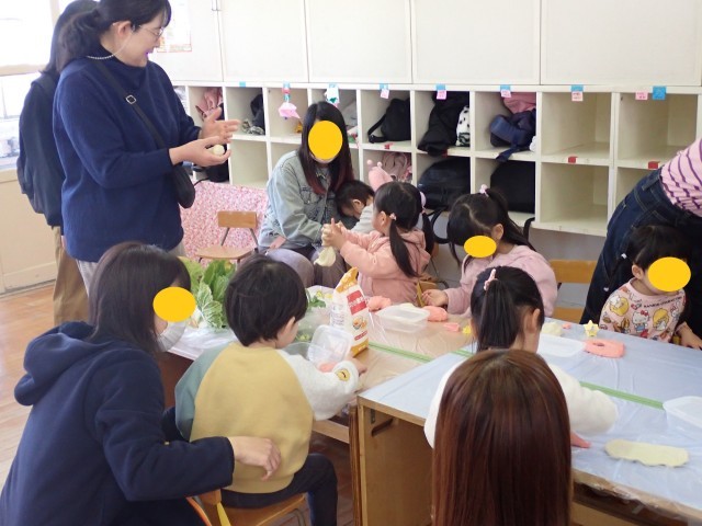 今日の遊びはお弁当づくり!小麦粉粘土で感触遊びをたっぷりした後、弁当箱にそれを詰め、お庭に持って行きました。お庭には春のお花や葉っぱ、オナモミなどがいっぱい!自然物をおかずにすると、かわいいお弁当ができました。