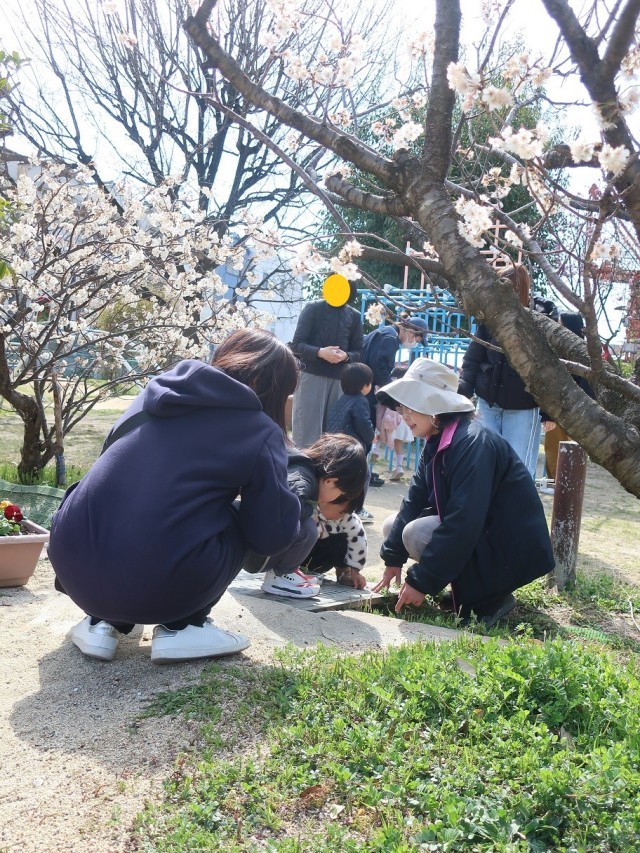 お庭にはツクシもありました。ツクシを指でちょんちょんと触ってみました。初めてのツクシとの出会いでした。