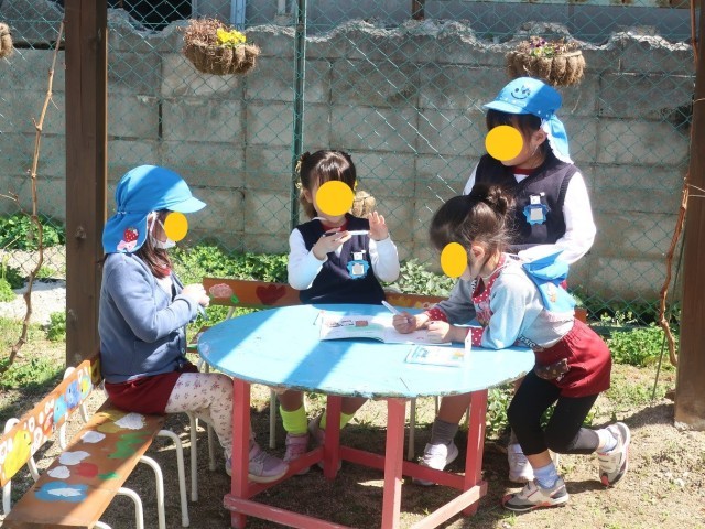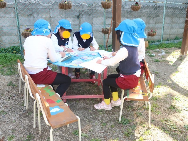 ここ最近、5歳児が夢中になって楽しんでいた遊びの一つを紹介します。お庭にノートとペンを持って行き、絵を描いています。実はこれは幼稚園のことを忘れないように書き記しているのです。ドッヂボールをしている友達、サンタさんが園舎の上を飛んでいるところ、ビオランドの子どもの家やデイゴの木etc・・・幼稚園の思い出を大切にしようと思ってくれていることが伝わり、とても嬉しかったです。