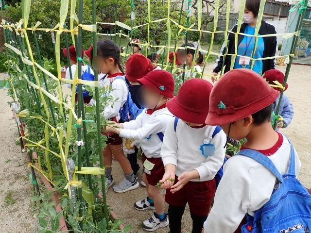 ふっくらと実ったさやをみつけると「これかな?」と目を輝かせながら収穫していました。