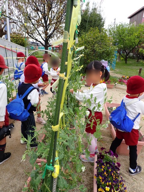 今週はお天気が雨になりそうな予感だったので、今日、去年度からお世話をしているスナップエンドウの収穫を行いました。