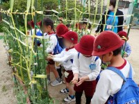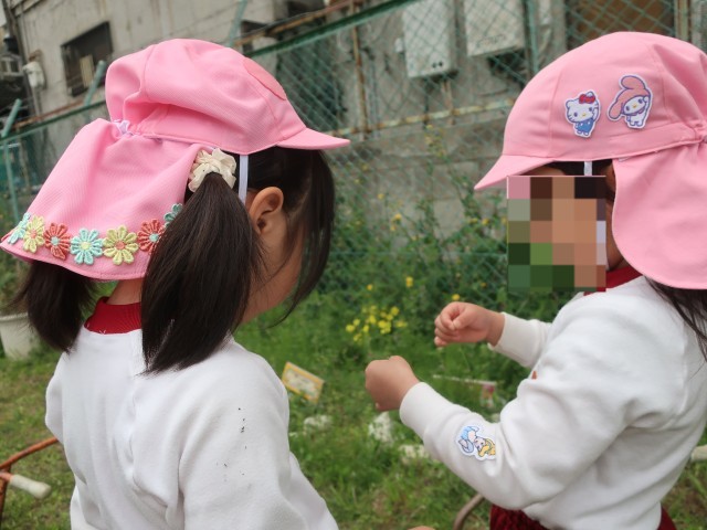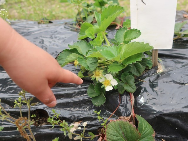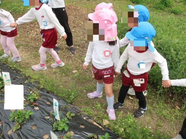「春休みの間に変わったところはあるかな?」という先生の問いかけに、昨年度畑に植えたイチゴの様子を見て「イチゴのお花が咲いてる!」「緑のイチゴができてる」と大喜びでした。「緑のイチゴはすっぱいんだよ」「早く赤くならないかな」と知っていることや楽しみな気持ちをたくさん話してくれました。