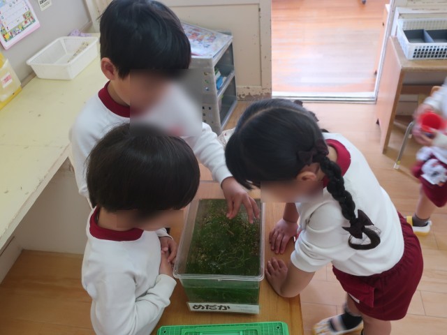 4歳児もも組のお部屋では、メダカを飼っています。
