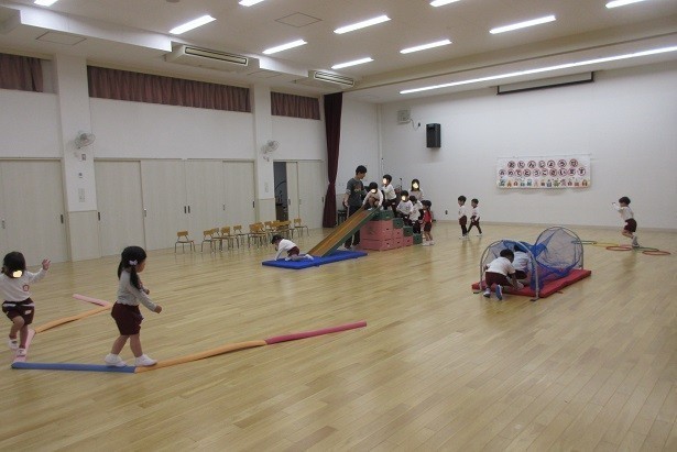 雨の日は外には行けませんが、ホールで音楽に合わせて踊ったり、巧技台を使って滑り台やトンネルなどで体を動かして遊ぶことができるようにしました。みんなとても楽しんでいましたよ。
