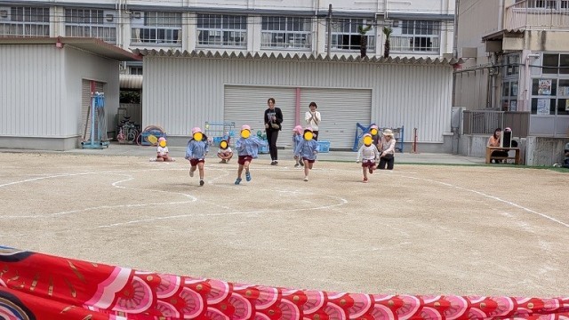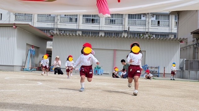子どもの日が近づいてきました。子どもたちは、こいのぼりが風に泳ぐ様子を見て喜んだり、それぞれのこいのぼりづくりを楽しんだりしています。そして、こいのぼりの下で、元気いっぱい体を動かして遊んでいます。今日もみんなで集会を楽しみました。いつものように体操などを楽しんだ後、今日はかけっこをして遊びました。3歳児あかぐみさんは、入園して初めてのかけっこです。4,5歳児が先に走り、走り方のお手本を見せてくれました。見ていると、僕たちも走りたい!と期待が高まります。先生の「よーいどん!」の合図で嬉しそうに走る姿がとても可愛かったです。
