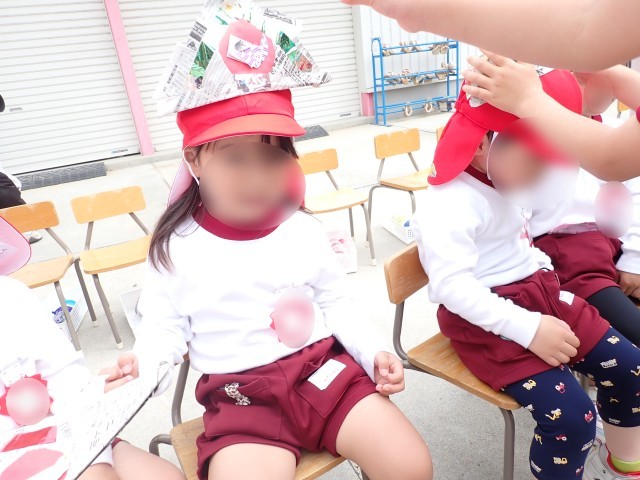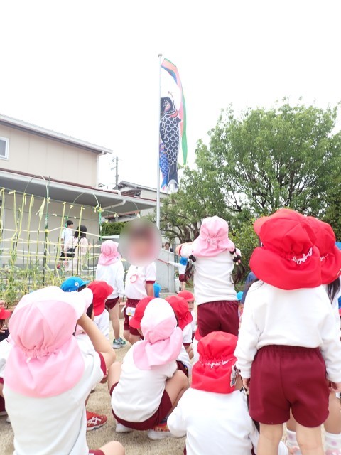 5歳児あお組がこいのぼりをもってみんなの周りを歩いてこいのぼりをあげたり、体操やかけっこをしたり、お家の人と触れ合い遊びをしたり楽しい時間を過ごしました。頑張ったあとはあお組から小さい組さんに兜のプレゼントをしましよ。前日まで小さい組さんのために内緒で一生懸命つくっていた兜です。