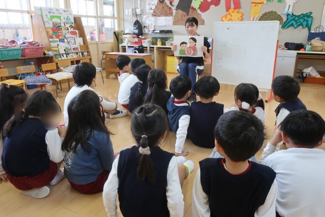 いのちの話では、絵本「すくすくいのち」を使いながらお腹の中のあかちゃんの成長の様子と、誰もが大切な命であることを伝えました。「赤ちゃん小さいね」「(赤ちゃんが)大きくなったら(お腹の中)狭そうだね」と興味を持っている様子でした。