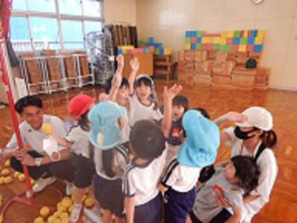 参加してくれた小さなお友達と一緒にお部屋で遊んだり、絵本を見たりした後、玉入れをしました。最後はチームに分かれて勝負をしたのですが、始める前にチームのみんなが集まって、「エイエイオー!」と掛け声を合わせてから勝負する姿も見られました。みんなで体を動かして遊ぶことを楽しめたかなと思っています。