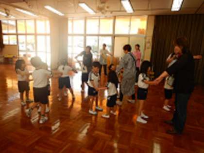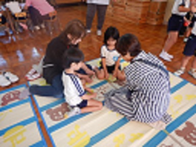 今日は、祖父母の会をしました。おばあちゃん達と一緒に「おせんべやけたかな」をしたり、「肩たたき」をしたりして触れ合って遊んだ後、トランプをしたり絵合わせカードをしたり、コマ回しをしたりしてほっこりと遊びました。最後にみんなで「ゆらゆらブランコ」の歌遊びをして、終始和やかな雰囲気のなか、会を終えました。会の前後にはそら組さんがお茶の接待をしてくれました。おばあちゃん達の優しさに触れて、素敵なひと時を過ごせました。