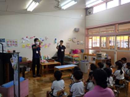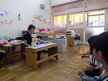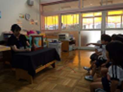 今日は、平野図書館の読み聞かせボランティアの方々が来てくださって、お話の会をしました。かわいいパペットで挨拶をしたら、お話の世界へと出発です。大きな絵本や紙芝居、組木のお話などで子どもたちはどんどんお話の世界に引き込まれていきました。絵本の絵をよく見ていて、前のページにいてたウサギが次のページにはいないと「どこにいったんだろう」と気が付いたり、少し静かなお話の時には真剣に話を聞いたりして、お話の雰囲気を味わって楽しんでいました。