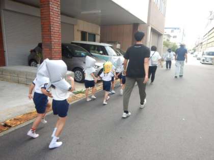 大きな地震によって津波がきたことを想定した避難訓練を行いました。今回の避難訓練では、幼稚園のすぐ近くにある二次避難場所の株式会社エスト—まで避難し、保護者の方の引き渡しの訓練も一緒に行いました。いつ起きるか分からない地震や津波に備え、子どもたちも意識をもって訓練をすることができました。避難訓練の経験を重ねていくことで、子どもたちは自分で防災頭巾をかぶることや、避難の仕方等も理解し、自分の身を守る方法を身に付けていっています。