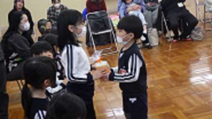 今週の水曜日にばら組の子どもたちが、もうすぐ修了するそら組さんに感謝の気持ちを込めて、お別れ会をひらきました。一緒に「この赤ちゃんは誰でしょう」クイズをしたり、フルーツバスケットのゲームをしたりして、そら組の保護者の方も一緒に参加して、みんなで楽しみました。最後にばら組からそら組へ、そら組からばら組へプレゼントを渡しました。「いっぱい遊んでくれてありがとう」や「一緒に遊んで楽しかったよ。忘れないでね」などメッセージを添えて一人ずつプレゼントを渡していく姿を見て、子どもたち同士がしっかりと関わり合ってきたのだなとしみじみと感じました。友達と一緒に楽しく遊んだ日々の思い出を大切に、次への一歩を歩んでくれたらと思います。