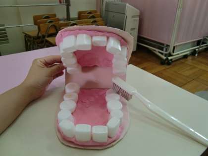 また、生え変わりの途中の前歯や6歳臼歯(第一大臼歯)は歯ブラシが届きにくいため、歯ブラシの向きを変えてみがくことも知らせました。