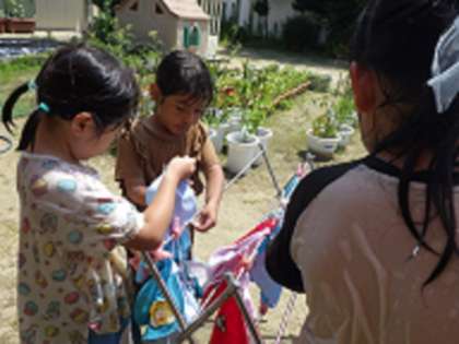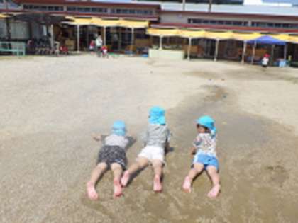 暑い日は、水がとっても気持ちよく感じますね。子どもたちは水遊びに夢中になっています。ホースとペットボトルでつくった噴水で、勢いよく出てくる水に大はしゃぎ!何度も噴水に顔を近づけていました。水浴びをいっぱいした後の地面の水たまりに寝そべって、まるでビーチに来たかのようにくつろいで楽しんでいました。