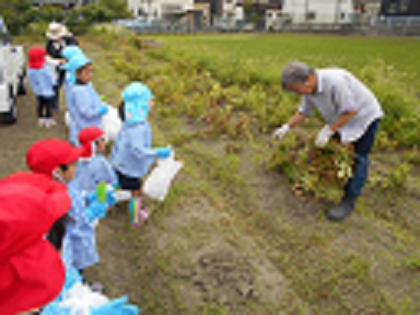 月曜日に地域の方のご厚意で、ジャガイモ掘りの体験をさせてもらいました。ジャガイモの茎を引っ張るとジャガイモが連なって出てくる様子に驚き、「わぁ〜!!」と歓声をあげていました。土の中を掘っていくと、大小いろいろな大きさのジャガイモがたくさん顔を出して、まるで宝物探しのようでした。翌日、美味しい新じゃがは、お弁当に入っていて、子どもたちは「おいしい!」と言って食べていました。