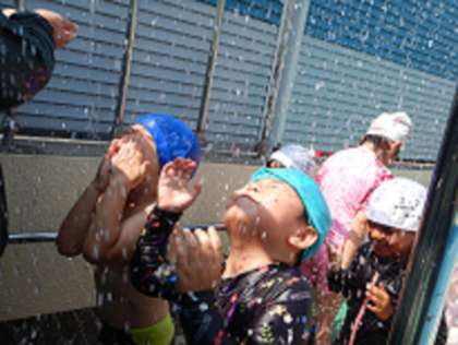 「はやくプールに入りたい〜!」と言っていた子どもたち。シャワーを浴びると、「気持ちい〜!」と顔からシャワーをかかる姿が見られるようになってきました。みんなで電車になって歩いたり、水鉄砲や浮き輪を使って遊んだり、プールの中でのお気に入りの遊びもできてきました。水の心地よさを存分に味わっています。