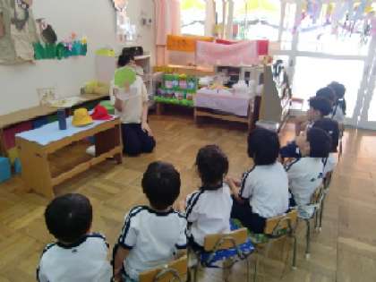 『あついひの おともだち』をいう紙芝居を読み、熱中症という病気があることや、予防のために大切な3つのおともだちについて話をしました。