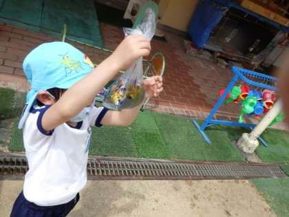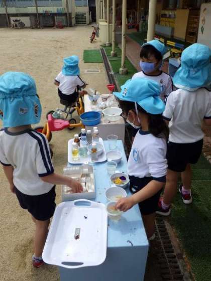 気温が高い日が続き、園庭では水をビニール袋に入れて遊んでいました。パンジーの花びらを入れて触っていたら水がきれいな色に変わってびっくり!こんな発見から色水ジュースづくりが始まりました。