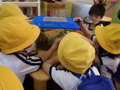 チョウチョを見つけてみんなで名前を調べ、虫眼鏡で様子を見る表情は真剣です。