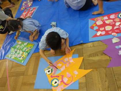 今日は、子どもの日に向けてこいのぼりをつくった後、あいにくの天気でしたが、体トンネル遊びをしたりキャッチボールごっこをしたりして、体をしっかり動かして遊びました。