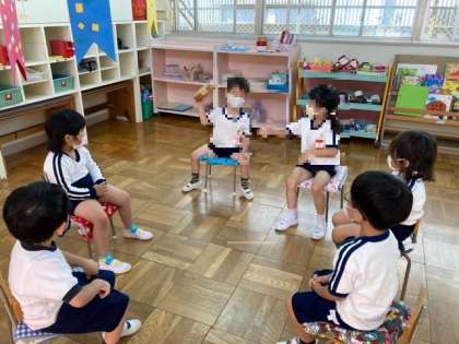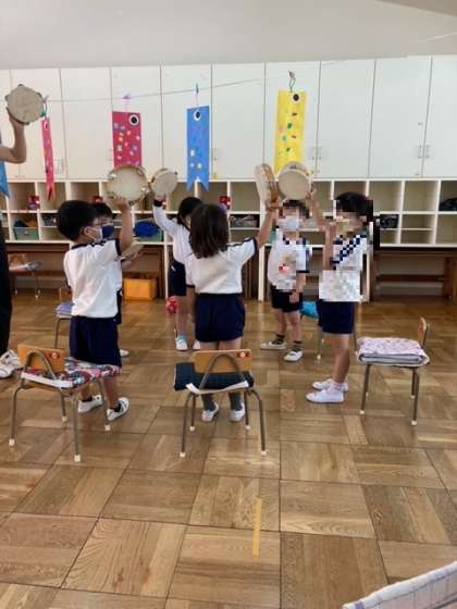 タンバリンの楽器を使い、いろいろな歌やリズムに合わせて鳴らして遊ぶことを楽しんでいました。「チューリップ」や「こいのぼり」の歌を歌いながら、また「エビカニクス体操」の曲では、ノリノリのリズムでタンバリンを鳴らすなど、とても楽しんでいました。最後は、ばら組コンサートを開催しました。ばら組の部屋の中につくった舞台の上に立って、二人ずつ好きな歌に合わせて発表ごっこをしました。楽器遊びでは、楽器を大切に扱い、片付けるなど、子どもたちの素敵な姿がたくさん見られました。