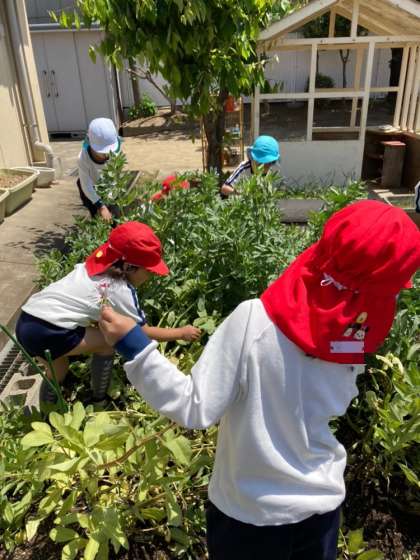 幼稚園の畑で育てているソラマメが大きく膨らんでいるのを見つけた子どもたち。みんなで収穫しよう!ということになりました。ソラマメの茎と葉っぱをかき分けて、大きくなっているソラマメを探し、ぐるぐるねじって収穫することを楽しんでいました。持ち帰ったソラマメ、おいしく食べてね。