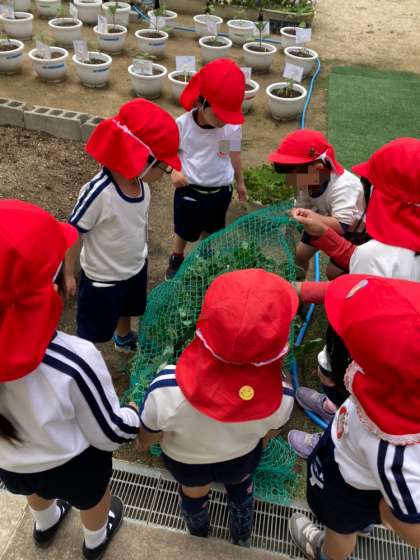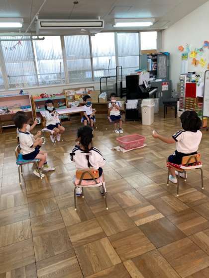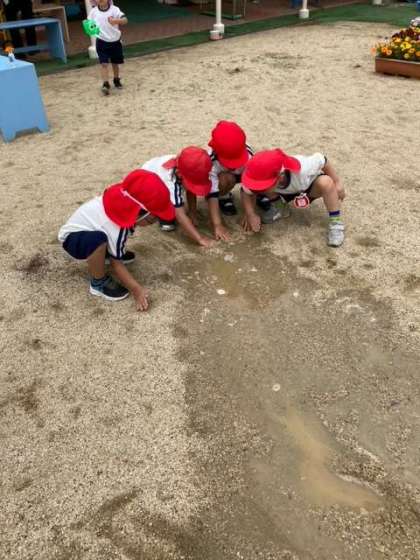 今日は、スズの楽器を使って、好きな歌に合わせて鳴らして遊んだり、園庭にバケツで水を流し、水の流れを友達と一緒に見たり、泥を触って遊んだりしました。また、みんなで園庭にできているイチゴの様子を見に行くと、イチゴが3つ赤くなっているのを見つけましたが、「ばら組みんなの分がないから、明日まで待ってみよう」ということになり、また明日、様子を見に行き、持って帰る相談をすることになりました。