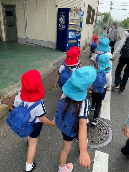 待ちに待った、ばら組との園外保育。ペアでしっかりと手をつないで、道路を歩きました。