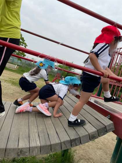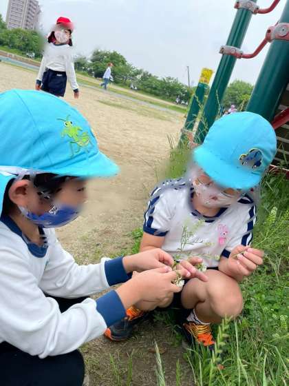 公園では、ユラユラ揺れる遊具にチャレンジしたり、シロツメクサでかんむりをつくったりして、笑顔いっぱいの子どもたちでした。