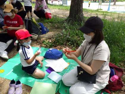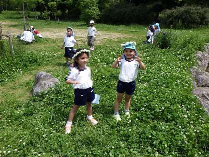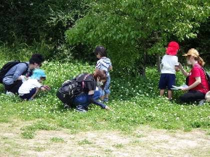 親子でシロツメクサのかんむりつくったり、四つ葉のクローバーを夢中で探している姿がほほえましかったです。また一つ楽しい思い出ができました。