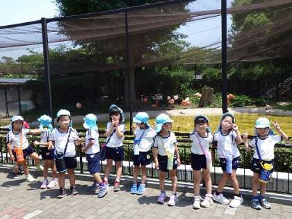 暑い一日でしたが、子どもたちは元気いっぱいで、いろいろな動物に興味津々の様子でした。フラミンゴを見たときは、「ピンク色と思ってたけど、何かいろんな色やねんなあ」「一本足にしてるとき、もう一個の足はどこに行ってるんやろ」などと口々に言いながら、立っている姿を真似て片足を上げてみたり、歩き方を真似してみたりしていました。
