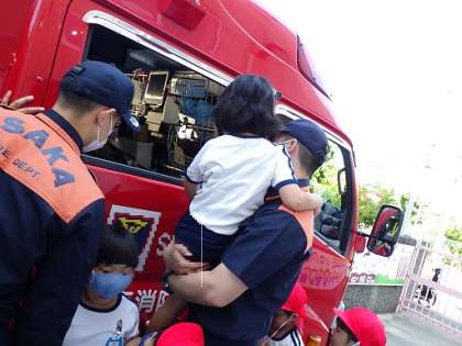 今日は保護者向けの救急救命講習会がありました。平野消防署から訓練用のAEDや子どもの人形を使った実践的な講習でした。その間、子どもたちは消防車を見せていただき、消防士さんに「ハシゴは何に使うんですか」「このホースはどうやって使うんですか」などと質問攻め。車の中を見たいと言った子どもをひょいと抱き上げてくれるたくましい姿に子どもたちは大喜びでした。最後は「なんで消防士になろうと思ったんですか」の質問に「強くてかっこいいから」との答え。子どもたちは「ぼくも消防士になりたい!」「私も!」と言っていました。将来の消防士がここから生まれるかも!?