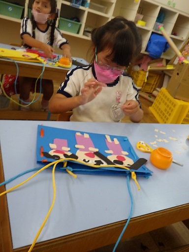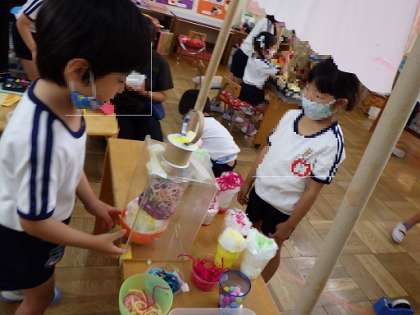 今日は、ばら組の子どもたちがお客さんになって来てくれたので、そら組の子どもたちは大はりきり!「いらっしゃいませー」「冷たくておいしいかき氷ですよ」などと大きな声で呼び込んでいました。その後の話し合いで「お店のチケットを入れるカバンがいるなあ」という声が上がり、さっそくカバンづくりが始まりました。