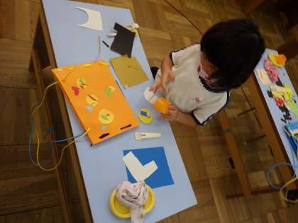 パンチで穴を開け、そこにリボンを通したり、好きな飾りを思い思いにつくって貼ったりして、世界に一つのすてきなカバンが出来上がりました。