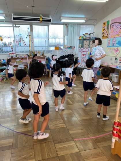 今日は、そら組とばら組でカメやイカ、タコ、クラゲ、サメなどの海の中の生き物になって遊びました。