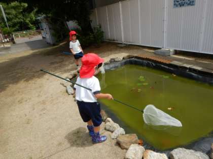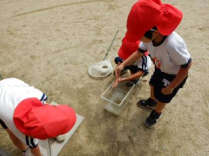 ばら組はビオトープでメダカ探し。網で捕まえようとしてもメダカの動きがすばやいので、なかなか捕まえるのが難しいようです。