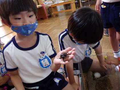 幼虫から育って成虫になったカブトムシを手にのせて遊ぶようになりました。毎日当番グループがゼリーを替える仕事をしますが、これも楽しくて、順番が回ってくるのを心待ちにしています。