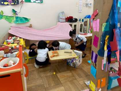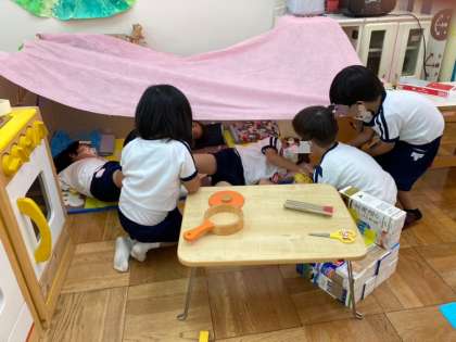ばら組の部屋の中にあった人魚の家の屋根が壊れてきていました。何度もガムテープなどで直していたのですが、今日、人魚の家を思いきって広く、新しくしようということになりました。「屋根はいる!」「ソファを置くことにしよう!」と子どもたちからの意見があがり、家の中の雰囲気も随分変わりました。みんなで屋根の下に入り、昼寝をしたり、ご飯を食べたりと、子どもたちは、友達と一緒に遊ぶことを楽しんでいました。