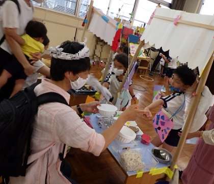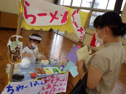 待ちに待った「縁日ごっこ」。おうちの方がたくさん参加してくださいました。、はりきっておいしいラーメンやかき氷をおうちの方にふるまったり、おうちの方がお店屋さんになってくださったりして、子どもたちにとってとても楽しいひとときになりました。