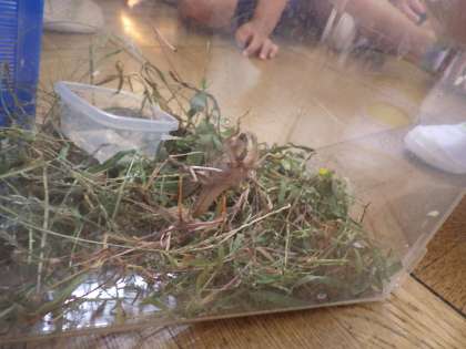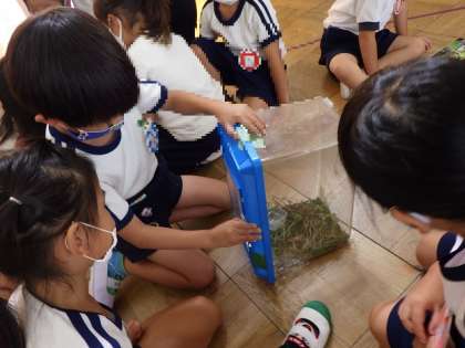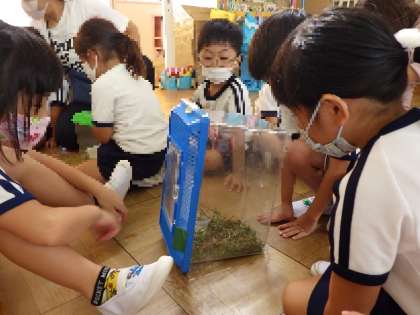 園庭で、年長児が見つけた大きなバッタ。さっそくみんなで図鑑を見ると、どうやらトノサマバッタかイナゴの仲間のようです。「王様バッタちゃん」という名前がつき、高く跳び上がれるように飼育ケースを縦に置いて様子を見守っています。「葉っぱが好きやねんて。草取ってこよう」「土つけて入れてあげようや」と言い合い、みんなで大事にしている姿がほほえましいです。