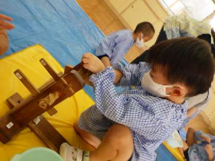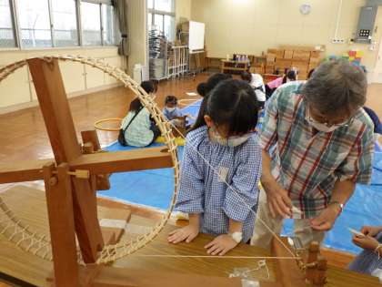 幼稚園で栽培、収穫したわたを使って、糸をつくる体験学習をしました。