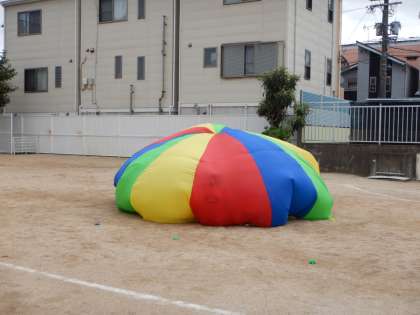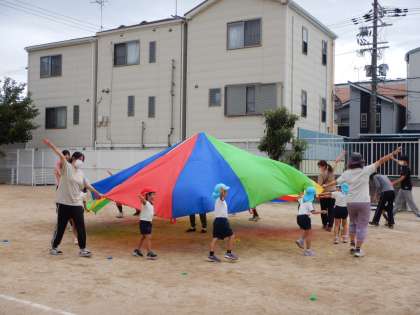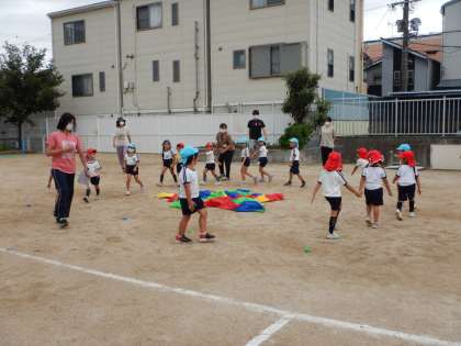 今日は、ばら組・そら組と一緒にパラバルーンをしました。